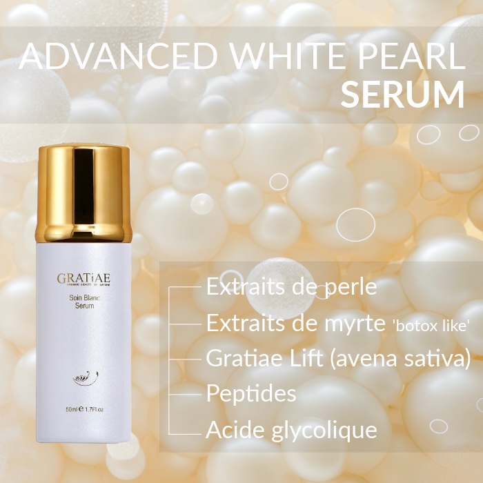 Elle contient pas moins de 16 acides aminés, d'oligo éléments, de protéines, de silice et de calcium, un cocktail anti-âge et embellissant à elle seule !! Elle illumine naturellement toutes les peaux et est bien sur réputée pour être un actif naturel très efficace contre les taches de pigmentation et de vieillesse, à elle seule elle assure une synthèse normale en mélanine et corrige les concentrations trop fortes de ces fibres (taches), ce qui provoque un éclaircissement progressif, doux et naturel des taches. La white pearl est aussi détoxifiante et antibactérienne et est recommandée pour prévenir et/ou traiter les petites irrégularités de la peau, l'acné. Enfin Elle favorise une hydratation saine,  stimule le renouvellement cellulaire et la synthèse de collagène pour une peau ferme, lisse, repulpée et un teint lumineux.